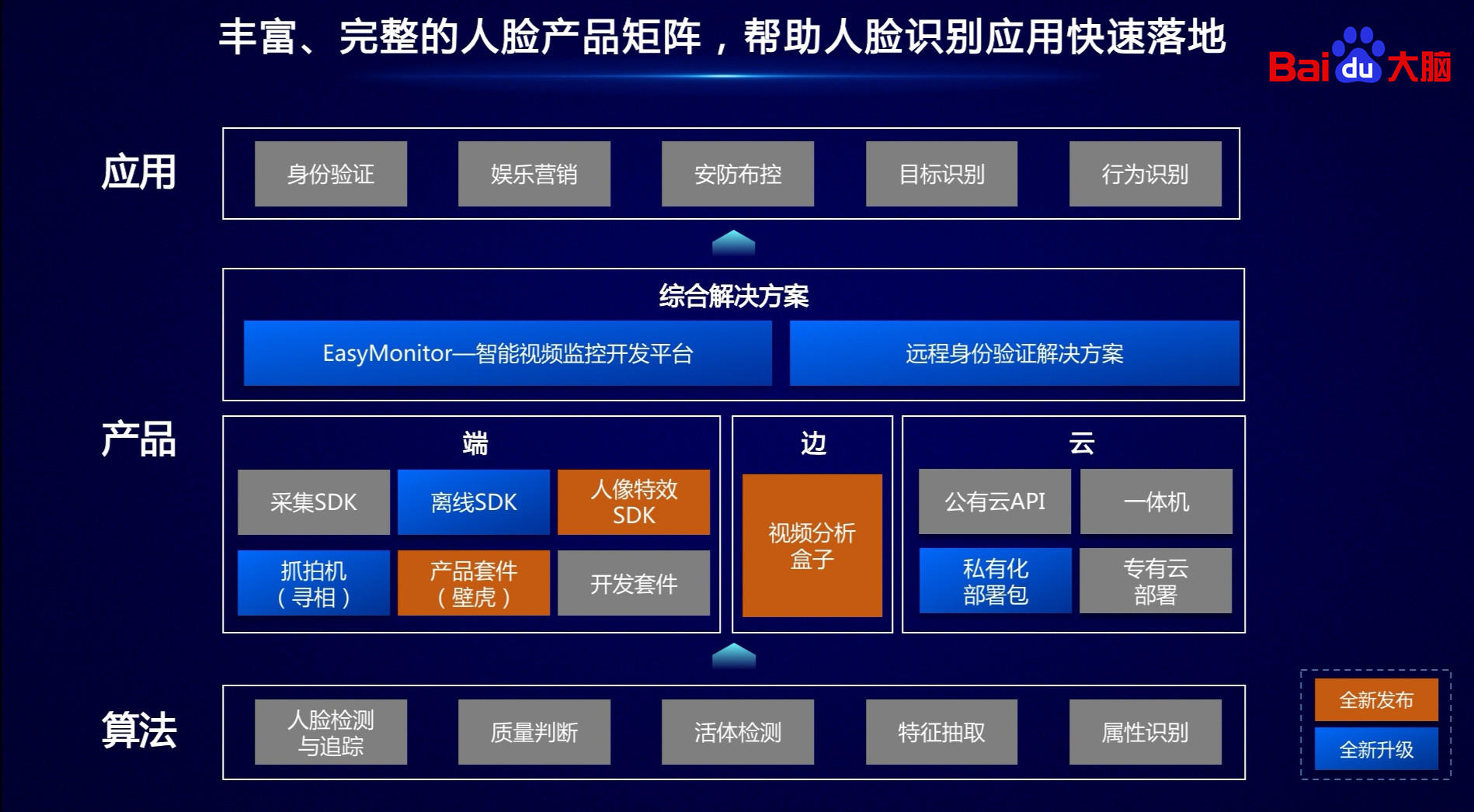 而在此次發(fā)布會上,百度大腦全新發(fā)布3款產(chǎn)品、5項升級。新產(chǎn)品包括:軟硬一體、快速上手開發(fā),配備外殼即可落地的人臉識別產(chǎn)品套件(壁虎);人像處理 SDK;小型化邊緣計算終端——人臉視頻分析盒子。在原有的人臉識別產(chǎn)品、方案的基礎(chǔ)上,全新升級的5項內(nèi)容,包括遠(yuǎn)程身份驗證方案;EasyMonitor—智能視頻監(jiān)控開發(fā)平臺;尋相人臉抓拍機;具備3D識別算法、算法泛化增強、模塊化計費等功能的人臉識別離線SDK;私有化部署包。百度大腦希望用更豐富完整的人臉產(chǎn)品矩陣,為廣大開發(fā)者、企業(yè)等用戶提供更全面、更安全、更完善的產(chǎn)品服務(wù)。