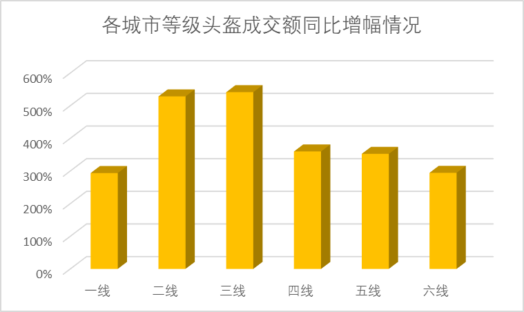 京東大數(shù)據(jù)顯示,5月以來,摩托車及電動(dòng)車頭盔受到消費(fèi)者的廣泛關(guān)注,不僅搜索量達(dá)到了去年同期的8倍,成交額同比增幅也接近400%。其中,江蘇、河南、天津、云南地區(qū)頭盔的成交額都達(dá)到去年同期的10倍以上,上海、河北、寧夏、安徽地區(qū)頭盔的成交額達(dá)去年同期的8倍以上,廣東省成交額同比增幅125%。從各城市等級的頭盔消費(fèi)數(shù)據(jù)來看,二線及三線市場增速更為明顯。