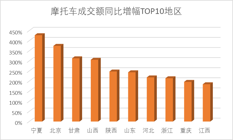 頭盔取得高速增長的同時(shí),摩托車、電動(dòng)車的成交額增幅也分別超過110%和50%。寧夏、北京、甘肅、陜西等地區(qū)摩托車成交額同比增幅較高,而西藏、北京、寧夏、甘肅等地區(qū)的電動(dòng)車成交額同比增幅較高。