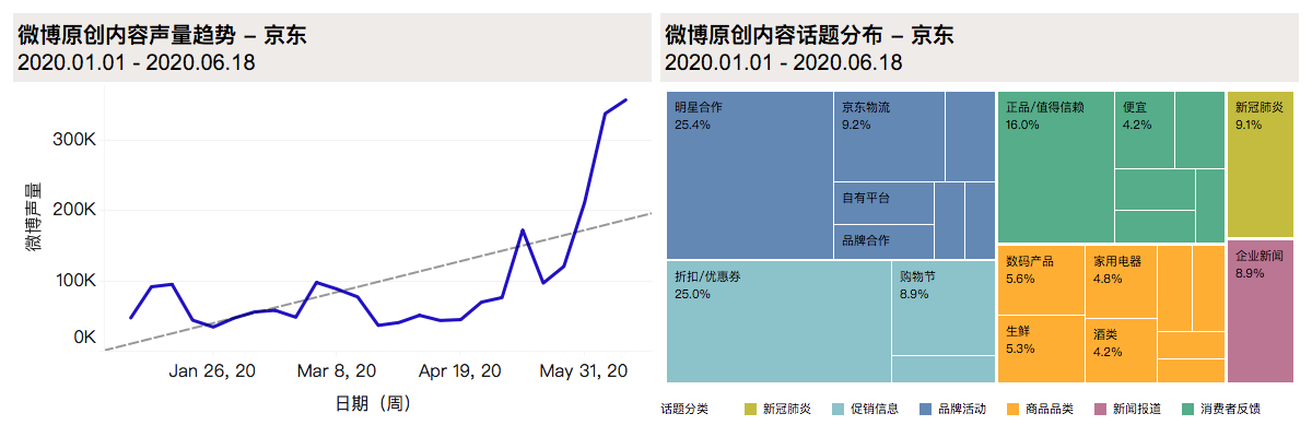 6月與疫情相關(guān)的話題內(nèi)容已降至全部話題的3%,表明用戶對疫情的關(guān)心已逐漸轉(zhuǎn)回到京東平臺核心功能上,即平臺的電商本質(zhì)。在用戶體驗(yàn)方面的反饋中,提及“京東值得信賴”的內(nèi)容占比近45%。京東在疫情爆發(fā)期間包括物資捐贈(zèng),醫(yī)療物資運(yùn)輸?shù)仍趦?nèi)的舉措使京東得到了社交媒體用戶的肯定與贊揚(yáng)。在618購物節(jié)開始后,用戶對京東平臺的討論也更多集中在“平臺大”、“信得過”等方面。