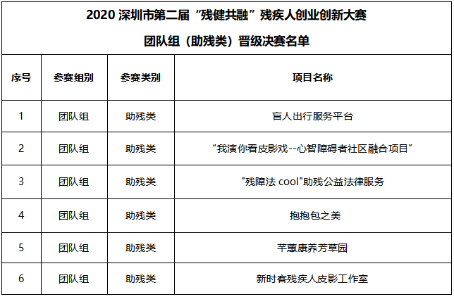 2020深圳市第二屆“殘健共融”殘疾人創(chuàng)業(yè)創(chuàng)新大賽團隊組(助殘類)晉級決賽名單