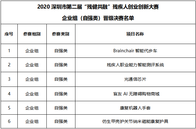 2020深圳市第二屆“殘健共融”殘疾人創(chuàng)業(yè)創(chuàng)新大賽企業(yè)組(自強類)晉級決賽名單