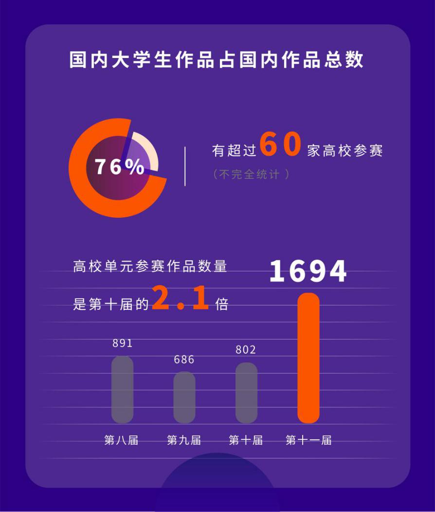 作為參與金鵬短片導(dǎo)演扶持計劃的重要力量,今年高校大學(xué)生的參賽積極性持續(xù)高漲。本屆短片節(jié)發(fā)起的“全國大學(xué)生視頻創(chuàng)意大賽”共收到來自全國超過60所高校的1694部參賽作品,數(shù)量同比增長一倍。國內(nèi)大學(xué)生參賽作品數(shù)量在所有國內(nèi)參賽作品總數(shù)中占比58%,大學(xué)生創(chuàng)作者一躍成為金鵬短片導(dǎo)演扶持計劃的中堅力量,凸顯了新時代下年輕創(chuàng)作者對短片以及短視頻的無限熱情和興趣執(zhí)著。大學(xué)生競賽單元將分別評選出“最佳大學(xué)生短片”、“最佳大學(xué)生劇情短片”、“最佳大學(xué)生紀(jì)錄短片”、“最佳大學(xué)生動畫短片”、“最佳大學(xué)生VLOG短片”、“最佳大學(xué)生科普短片”、“最佳大學(xué)生廣告創(chuàng)意短片”、“最佳大學(xué)生原創(chuàng)音樂短片”等9大類型入圍優(yōu)秀作品。