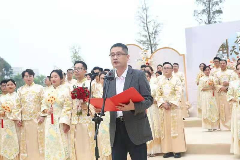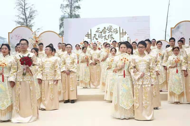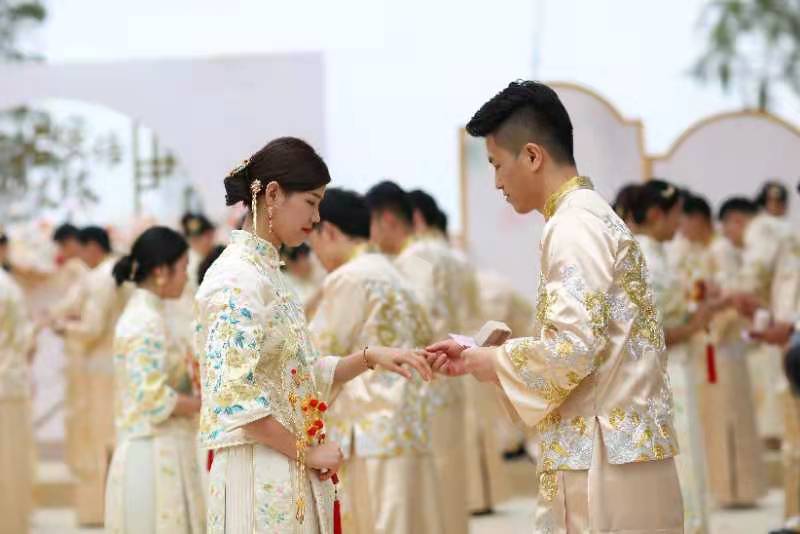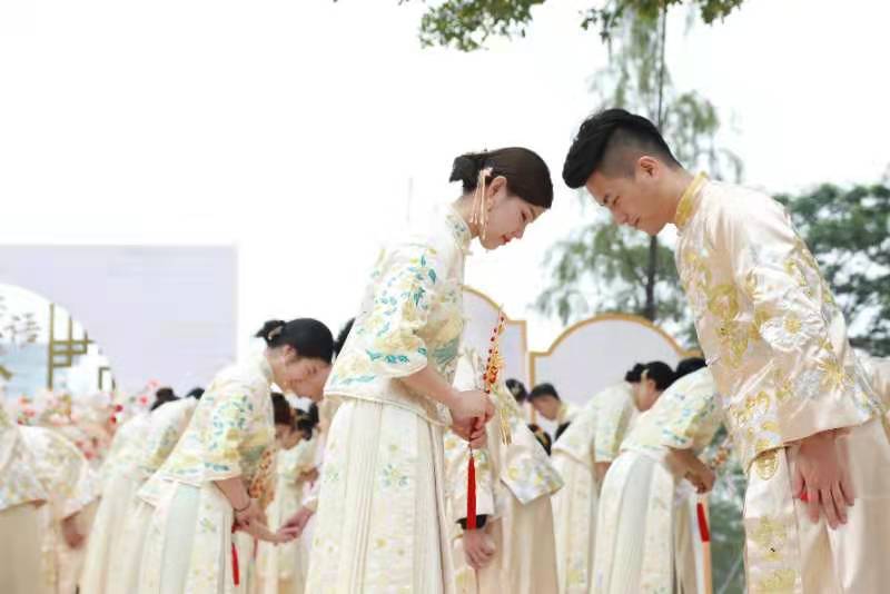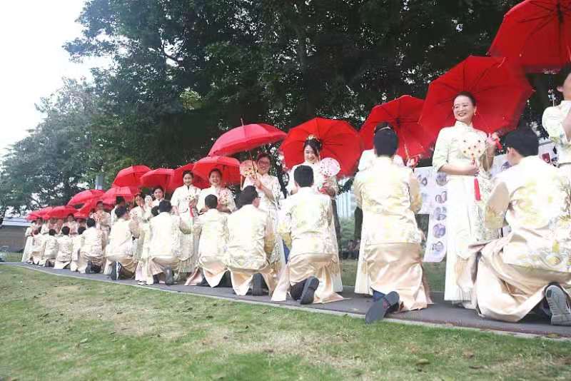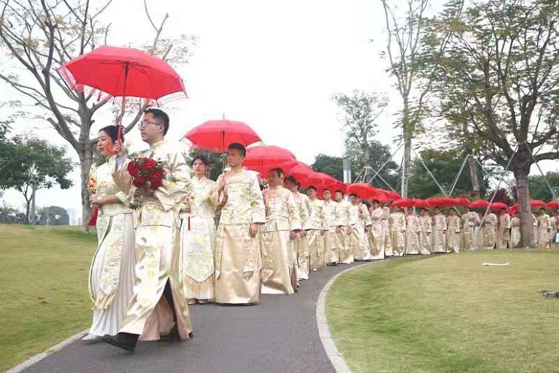 活動伊始,新人手舉紅傘穿過連理橋,在玫瑰園情話闖關,在中西禮堂進行找新娘等默契互動,在自然展覽廳俯瞰香蜜公園全貌,與林立高樓與大片叢林相映成景的最美天際線合影,最后在氤氳浪漫的花香湖和花蜜湖畔,在親友與來賓的祝福下,40對新人身穿中式禮服,誦讀莊嚴的誓詞,許下今生不變的承諾。