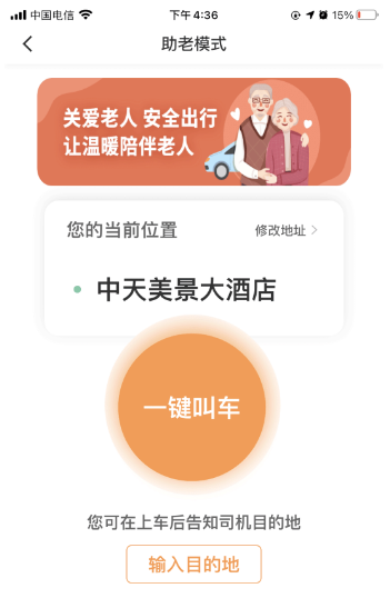 打開萬(wàn)順叫車APP、小程序,醒目的助老模式按鈕,按下一鍵叫車大按鈕就能呼叫萬(wàn)順叫車,無需輸入目的地,簡(jiǎn)化繁瑣叫車流程。