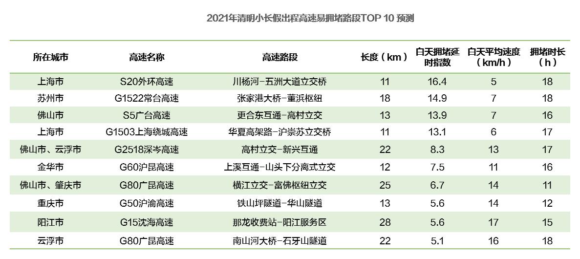 高速擁堵路段:上海S20外環(huán)高速和S51肇陽(yáng)高速云浮段預(yù)計(jì)最堵