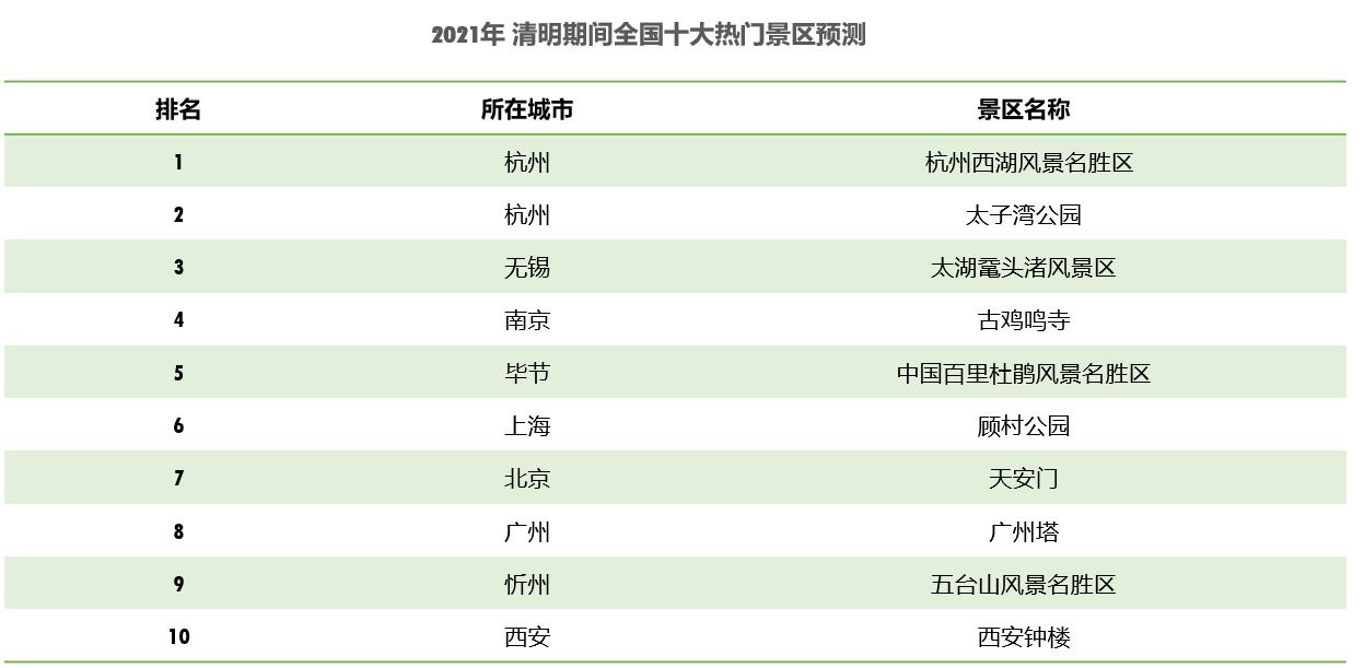 預(yù)計(jì)清明假期杭州西湖風(fēng)景名勝區(qū)最為熱門(mén),其次為太子灣公園、太湖黿頭渚風(fēng)景區(qū)、古雞鳴寺、中國(guó)百里杜鵑風(fēng)景名勝區(qū)、顧村公園、天安門(mén)、廣州塔、五臺(tái)山風(fēng)景名勝區(qū)、西安鐘樓。
