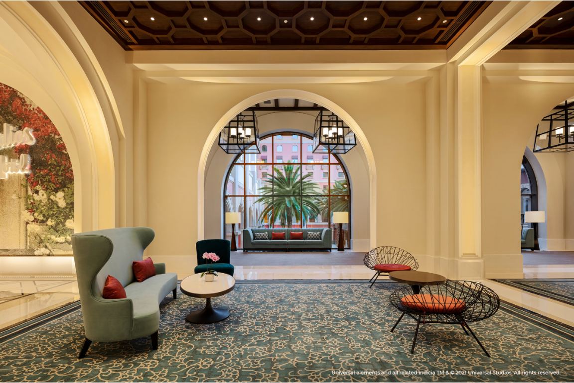 環(huán)球影城大酒店位于北京環(huán)球影城主題公園入口,入住賓客將可以俯瞰園區(qū)的絕佳景觀。作為全球首家以環(huán)球品牌命名的主題酒店,環(huán)球影城大酒店在設(shè)計中融入了極具加州特色的西班牙復(fù)興風格,巧妙再現(xiàn)好萊塢電影黃金時代的輝煌與風華,同時結(jié)合了中性色調(diào)的現(xiàn)代演繹以及繽紛色彩點綴。酒店大堂內(nèi)西班牙風格的噴泉和玻璃馬賽克三角梅花墻帶來輕快靈動的熱帶海岸氣息,定制的橙花調(diào)香氛則令人仿佛置身加州,讓賓客感受到典雅而充滿活力的度假氛圍。酒店公共區(qū)域內(nèi)的珍貴電影海報將帶領(lǐng)賓客探尋動人心扉的光影世界背后,精彩絕倫卻不為人知的創(chuàng)作瞬間。從復(fù)古經(jīng)典系列,到現(xiàn)代電影杰作,更有大量的幕后花絮呈現(xiàn)一段歷久彌新的電影之旅,回溯環(huán)球超過一個世紀的電影歷史的光輝歷程,致敬品牌在光影史上的耕耘與貢獻。