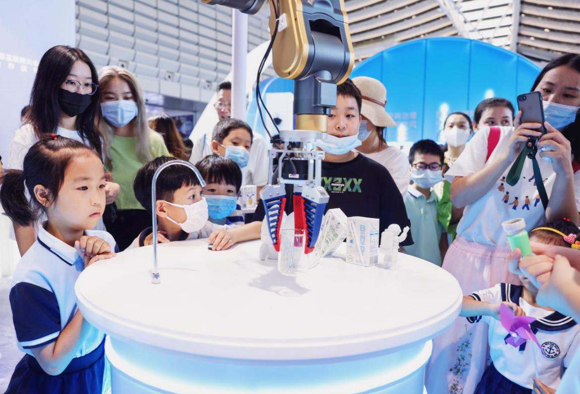 這牛奶和其他的不太一樣,很香濃?!半x心精萃‘白科技’開(kāi)啟臻濃新紀(jì)元”展臺(tái)一直就是博覽會(huì)現(xiàn)場(chǎng)的“人氣王”,這里以宇宙探索為主題,科幻感十足,火箭發(fā)動(dòng)機(jī)噴出淡淡煙霧,三臺(tái)智能機(jī)械臂不停忙碌,人們排起長(zhǎng)隊(duì),品嘗由“離心精萃科技”現(xiàn)場(chǎng)調(diào)制的伊利臻濃牛奶。在這里,吸引觀眾的不僅是美味的伊利牛奶,也有滿(mǎn)滿(mǎn)的數(shù)字科技。