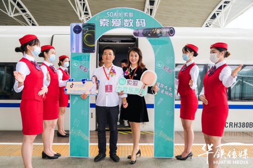 10月28日上午,索愛集團董事長劉建佳、總經(jīng)理全雪梅、華鐵傳媒集團廣州分公司銷售總經(jīng)理劉延群等領(lǐng)導(dǎo)嘉賓共同為冠名發(fā)車儀式揭幕、剪彩、互贈紀(jì)念禮品,在現(xiàn)場嘉賓的共同見證下,張貼索愛全新品牌代言人陳小春夫婦形象宣傳海報的“索愛-為音樂而生”高鐵冠名列車正式啟程。