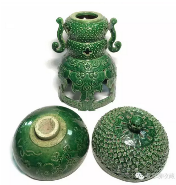 香薰在古代是頗為流行的室內(nèi)陳設(shè)用器,形制多樣,材質(zhì)不一。漢唐時期出土的香薰眾多,如有名的漢代博山爐,唐代香薰球等。兩宋時期,實行文人治國,香具更是盛行,影響所及,同時并存的遼、金兩朝也頗為風(fēng)行。當(dāng)然,香具中也區(qū)分宅舍用及寺廟用、宮殿用等。其中寺廟及宮殿用品多為成對擺放,講究對稱之美,顯得莊重大方。而宅舍之用更為推崇雅致,趣味。下面介紹的這件綠釉香薰應(yīng)為遼金時期的寺廟用品。 香薰高31.5cm、直徑14.5cm,整體呈豆式。豆是先秦禮器,用以在祭祀、宴饗中盛放肉食。在家廟祭祀中,豆是不可或缺的禮儀用具,早期豆用竹編成,后用青銅鑄造,因此在禮書中稱“籩豆”。此對香薰延續(xù)了青銅豆的大體形制,上作球形,香盤半圓,蓋為鏤空半圓,扣合后渾然如一。香盤可拆卸,安插于支座上。座上部為雙扁圓狀疊壓,兩側(cè)裝飾螭龍耳;下部呈鏤空裙擺式,承以托泥,穩(wěn)重大方。通體施綠釉,釉面潤澤,純凈自然。器身點綴穿花龍紋,如意紋,加之裙擺上的龕形開光,推測為當(dāng)時高等級的寺廟的佛前薰香供器。 欣賞更多藏品,歡迎瀏覽【黃志博物館】網(wǎng)站。 我們會介紹更多的收藏知識、推薦更多優(yōu)質(zhì)優(yōu)價的藏品供您了解和選擇,也歡迎您把這些分享給朋友們,讓大家一起來了解歷史文化、體會收藏的快樂!