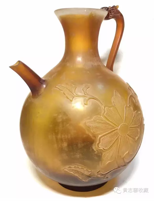 琉璃在唐代極為名貴。這從史書記載可窺一二。房玄齡的《晉書》中有關(guān)于琉璃器的記載“(王濟(jì))性豪侈,麗服玉食……帝嘗幸其宅,供饌甚豐,悉貯琉璃器中?!蓖鯘?jì)在招待皇帝時(shí)用了成套的琉璃碗盤,以逞其豪富,可見當(dāng)時(shí)琉璃器之貴重或要超過金、銀等器。又如宋代司馬光主編的《資治通鑒》中記載了這樣一段歷史事實(shí):嶺南節(jié)度使路嗣恭在平息叛亂中趁機(jī)劫掠商民,得到了大批財(cái)物。他把其中一個(gè)直徑九寸的琉璃盤獻(xiàn)給了唐代宗。唐代宗非常高興,“以為至寶”。法門寺地宮出土的唐代琉璃器大多為皇家捐贈的禮佛之物也可佐證其珍貴。 這件執(zhí)壺為琉璃材質(zhì),高20cm、腹徑14.5cm,色澤黃褐,半透明,晶瑩潤澤,光澤柔和。小口,束頸,腹部圓鼓,餅足;前有直流,后為龍柄。整體形制穩(wěn)重大方,圓潤飽滿,具有典型的唐代特征。壺身兩面刻有菊紋,線條流暢自然,勁健有力。整體透入出唐人的灑脫自信。這類唐代的琉璃作品存世極少,目前為數(shù)不多的一些作品大多出自窖藏、地宮及貴族墓葬,屬于珍稀文物。此件執(zhí)壺保存完整,尤為難得。 欣賞更多藏品,歡迎瀏覽【黃志博物館】網(wǎng)站:www.huangzhimuseum.com?