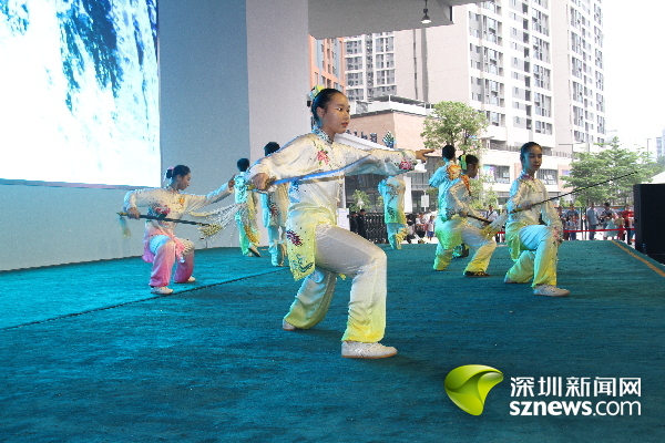 來自前海小學、西麗二中和大沖學校的老師們,也在臺上一展身手,他們出拳和刀棍展示更加虎虎有聲,氣勢如虹,英姿颯爽,霸氣十足。