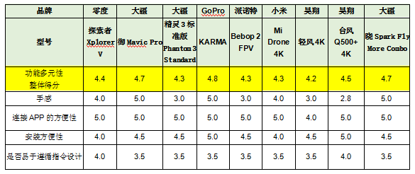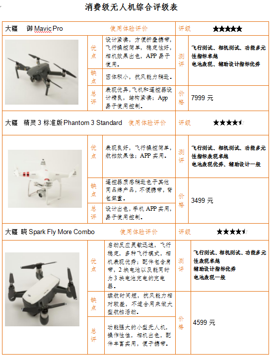 其中大疆的“御Mavic Pro”和“曉Spark Fly More Combo”表現(xiàn)出眾,獲得5分滿分。