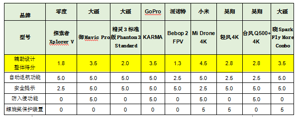 輔助設(shè)計(jì):小米“Mi Drone 4K”占絕對優(yōu)勢。在失聯(lián)時(shí)自動(dòng)返航,防侵入功能和螺旋槳保護(hù)裝置三個(gè)方面的設(shè)計(jì)較其他產(chǎn)品優(yōu)勢突出。