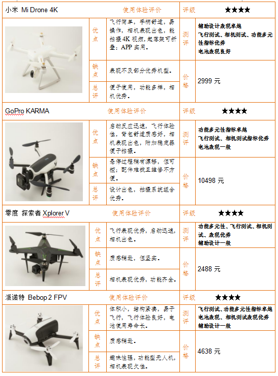 總評:小米“Mi Drone 4K”輔助設(shè)計(jì)表現(xiàn)最好,獲評4.5分。派諾特“Bebop 2 FPV”和零度“探索者Xplorer V”表現(xiàn)較差,僅獲評1.3分和1.8分。詳見下表。