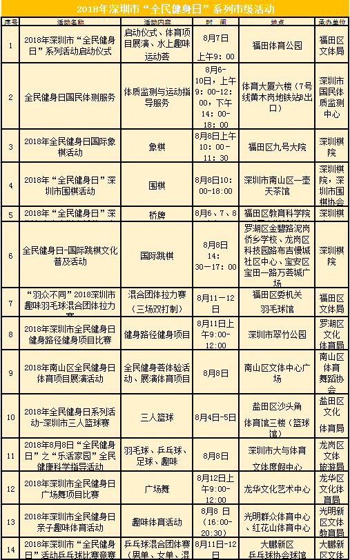 ????為方便更多群眾加入全民健身隊(duì)列,在今年的“全民健身日”,深圳市文體旅游局將在8月4日至12日,在全市開(kāi)展全民組織開(kāi)展,其中市級(jí)活動(dòng)14項(xiàng),各區(qū)也將因地制宜對(duì)活動(dòng)進(jìn)行時(shí)空拓展。下表為14大市級(jí)活動(dòng)詳情。