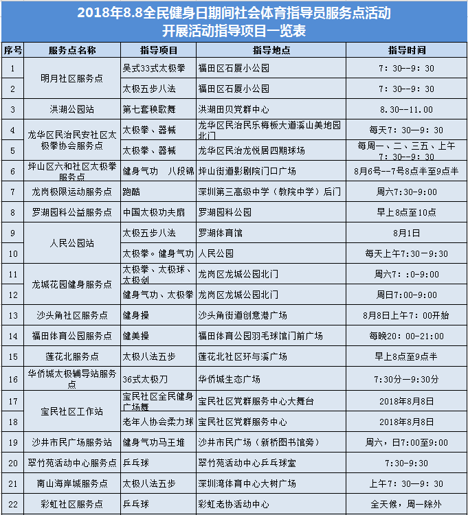 ????2018年8月8日,經(jīng)深圳市文體旅游局統(tǒng)計(jì),在“全民健身日”期間,深圳將有近50個(gè)全民健身站點(diǎn),為市民提供健身科普、大講堂、免費(fèi)咨詢及健身指導(dǎo)等,健身內(nèi)容涵蓋武術(shù)、舞蹈、健身操、球類等眾多項(xiàng)目。