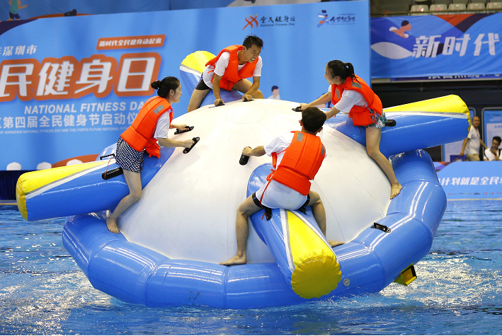 啟動儀式結(jié)束后,現(xiàn)場的泳池內(nèi)還開展了全民運動薈板塊的水上趣味運動會項目。