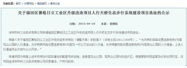而據(jù)資料記載,市規(guī)土委曾經(jīng)在2015年4月10日,在福田管理局官網(wǎng)上發(fā)布了《關(guān)于福田區(qū)賽格日立工業(yè)區(qū)升級(jí)改造項(xiàng)目人行天橋生態(tài)步行系統(tǒng)建設(shè)項(xiàng)目選址的公示》,其中明確提到“根據(jù)《關(guān)于福田區(qū)賽格日立工業(yè)區(qū)升級(jí)改造專項(xiàng)規(guī)劃(調(diào)整方案)的批復(fù)》(深規(guī)土函[2011]1929號(hào)),‘允許跨彩田路設(shè)置連接地塊2與蓮花山公園的人行通道,允許跨筍崗路設(shè)置連接地塊2與蓮花一村公交站臺(tái)的人行道,允許跨皇崗路設(shè)置連接地塊2與筆架山公園的人行通道。上述人行通道須全天候?yàn)楣婇_放’。”