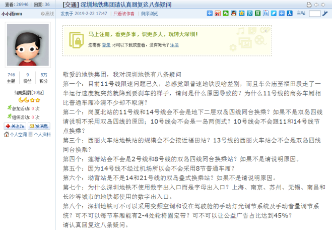 2月22日,有市民在深圳論壇發(fā)帖《敬愛的地鐵集團(tuán),我對深圳地鐵有八條疑問》,對深圳地鐵提出一系列專業(yè)且詳細(xì)的問題:“11號線限速問題由來已久”“11號線商務(wù)車廂比普通車廂冷清不少卻不取消”,對新建地鐵線路的換乘方式、14號線采用普通車廂還是商務(wù)車廂、西麗站的規(guī)模等建設(shè)方案提出疑問,并質(zhì)疑地鐵站出入口使用字母標(biāo)識而不是數(shù)字標(biāo)識是否合理。帖文中也提出了“采用變頻空調(diào)”“手動燈光調(diào)節(jié)系統(tǒng)及手動音量調(diào)節(jié)系統(tǒng)”“每節(jié)車廂能有2-4處輪椅固定帶”等建議,并希望“車站內(nèi)公益廣告占比要達(dá)到45%”。