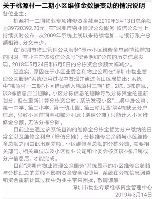 3月18日,南山區(qū)住房和建設(shè)局通過(guò)深圳論壇進(jìn)行公開(kāi)回應(yīng),稱(chēng)經(jīng)向市物業(yè)專(zhuān)項(xiàng)維修資金管理中心查詢(xún),原因在于桃源村三期1棟、2棟、3棟信息刪除及分棟資金的重新劃分,以致小區(qū)首期維修金和部分利息(增長(zhǎng)分?jǐn)偅┲荒苡?jì)入小區(qū)維修金總額,無(wú)法分棟分?jǐn)偂?/span>
