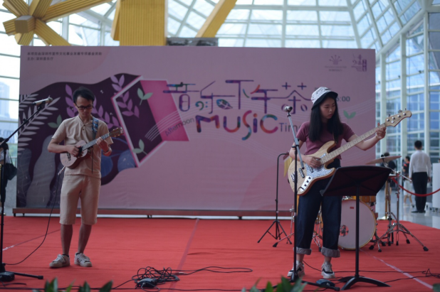畢業(yè)于深圳大學(xué)金鐘音樂學(xué)院的主唱周鈺城帶來兩首尤克里里樂隊(duì)歌曲, Jason Mraz 的經(jīng)典曲目《 I’ m Yours 》和英國當(dāng)紅歌星 E d sheeran 的 《 Thinking out Loud 》,周鈺城富有磁性的嗓音,在深圳夏威夷小吉他協(xié)會(huì)理事謝佳宜的尤克里里琴聲以及同樣畢業(yè)于深圳大學(xué)金鐘音樂學(xué)院的鼓手黃曉輝的鼓聲伴奏中,美妙的融合在一起。