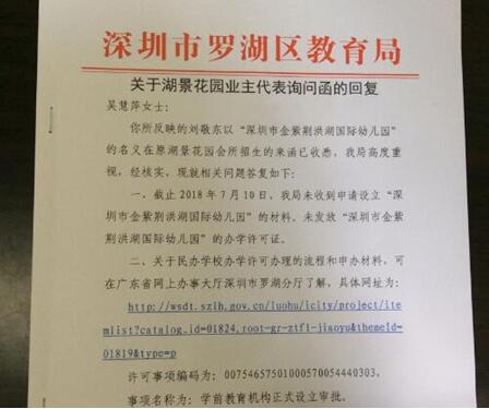 6月16日,市民在深圳論壇以《舉報湖景花園會所開辦幼兒早教班違法招生》為題發(fā)帖反映,羅湖區(qū)湖景花園第四屆業(yè)主委員會于2018年7月曾去函羅湖區(qū)教育局,詢問“深圳金紫荊洪湖國際幼兒園”是否具備招生資格。教育局明確回復(fù):未收到該幼兒園的申請資料,也未發(fā)放該園的辦學(xué)許可。