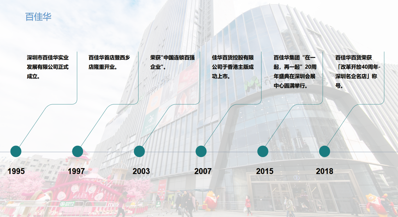 深圳市百佳華百貨有限公司是一家以中國商務部批準成立的外商投資企業(yè),注冊資金22040萬元。目前,公司在深圳、佛山、南寧等地開設有十多家連鎖購物商場,經(jīng)營面積約30萬平方米,年銷售額超20億元。于2007年5月21日在香港聯(lián)交所主板成功上市,成為廣東省為數(shù)不多的實現(xiàn)整體上市的零售企業(yè)。