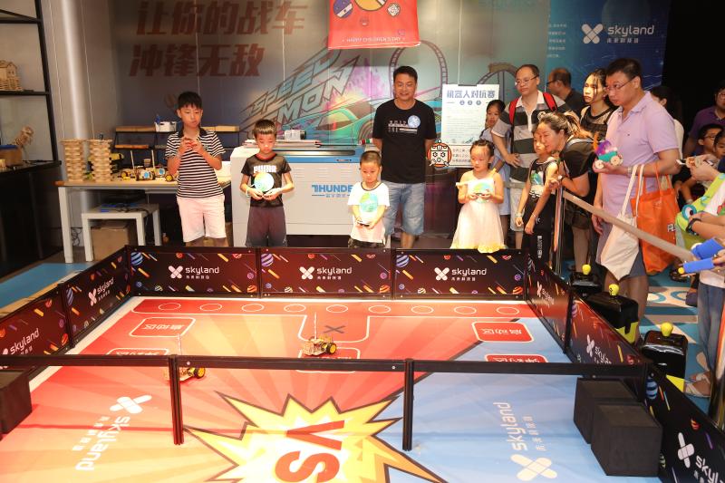 “我跟你說噢,那邊吹出來的泡泡能把我們倆都包進去!”“老媽,原來空氣的形狀是圓環(huán)形的呀……”歡聲笑語中,十幾項科技趣味項目讓小朋友們眼花繚亂、目不暇接,這其中,機器人對抗賽無疑是人氣最高的。賽場上,小朋友們分為紅藍兩隊,手持遙控器在兩側站好?!靶∨笥褌冏⒁饫?,每一位機器人身上有一個藍色燈柱,碰撞擋板被撞到后,燈柱長度會縮短……”老師一邊在“戰(zhàn)場”中擺放機器人,一邊為孩子們詳細講解規(guī)則。一聲哨響,紅藍兩隊的“機器人大戰(zhàn)”拉開了帷幕,孩子們操控著自己的戰(zhàn)車,左右閃躲,時而用一個漂亮的側移甩掉追擊者,時而全力沖擊消耗對方的“藍條”。賽場邊的家長們似乎比小選手更為緊張,他們時不時俯下身子,為孩子們出謀劃策:“小超你看,邊上那個三號車藍條快沒了,快趕過去補一下!”一位父親看到了打破僵局的好機會,急忙提醒道,小朋友則心領神會,熟練的操縱著機器人貼了上去……經過一番努力,在成功拿下這寶貴的一分后,小朋友回頭與自己的老爸相視一笑,父子二人之間的默契,在這一刻體現的淋漓盡致。