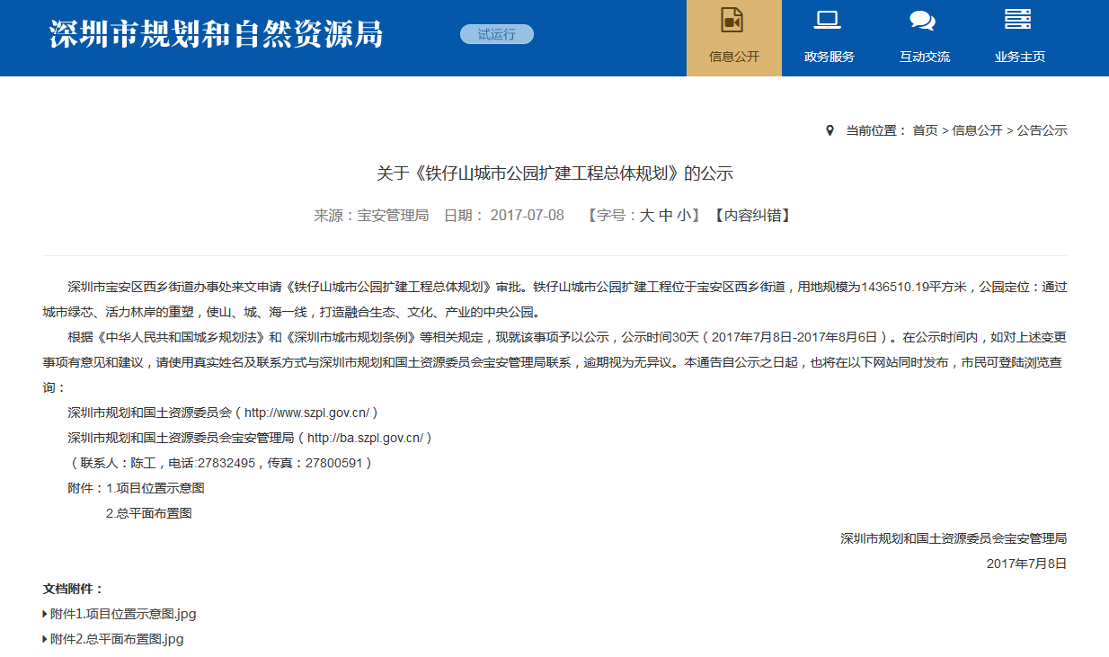 早在2017年,當(dāng)時(shí)的市規(guī)土委曾經(jīng)在官方網(wǎng)站發(fā)布了《關(guān)于<鐵仔山城市公園擴(kuò)建工程總體規(guī)劃>的公示》:深圳市寶安區(qū)西鄉(xiāng)街道辦事處來(lái)文申請(qǐng)《鐵仔山城市公園擴(kuò)建工程總體規(guī)劃》審批。鐵仔山城市公園擴(kuò)建工程位于寶安區(qū)西鄉(xiāng)街道,用地規(guī)模為1436510.19平方米,公園定位:通過(guò)城市綠芯、活力林岸的重塑,使山、城、海一線,打造融合生態(tài)、文化、產(chǎn)業(yè)的中央公園。