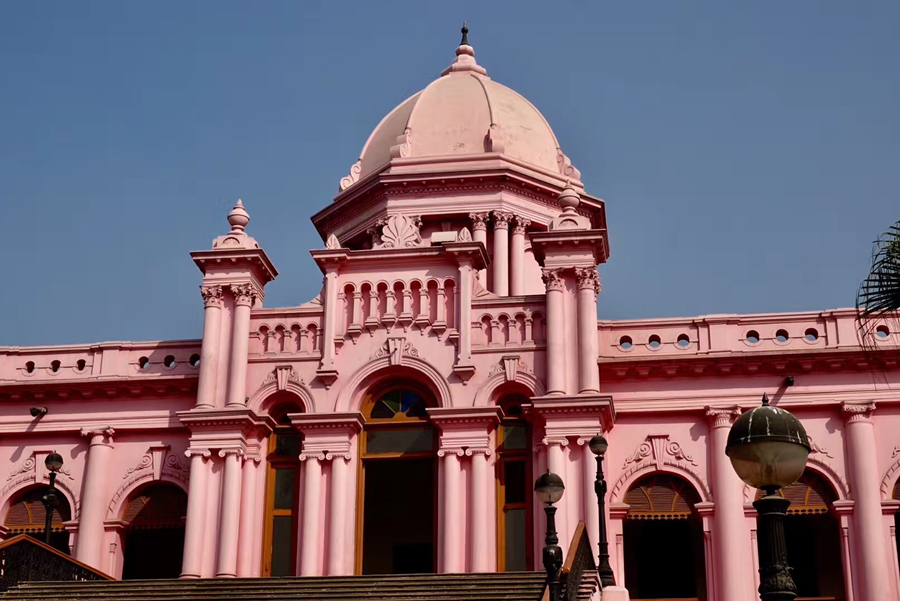 距孟加拉恒河渡口不遠(yuǎn)的地方有一座粉紅色宮殿式的豪華建筑。那是1872年一位名叫阿赫桑曼濟(jì)勒的地主在法國人留下的倉房基礎(chǔ)上改建的私邸,后來曾在一次龍卷風(fēng)襲擊時(shí)受創(chuàng)。李仁奇 攝