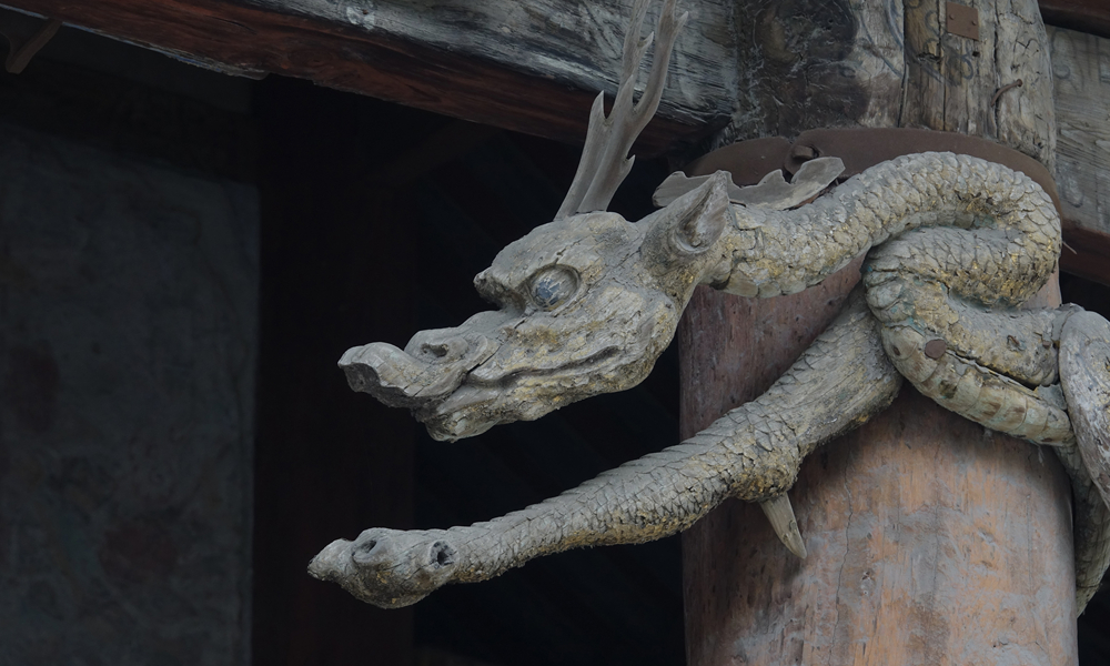 圣母殿前柱上的八條木雕盤龍。李仁奇 攝