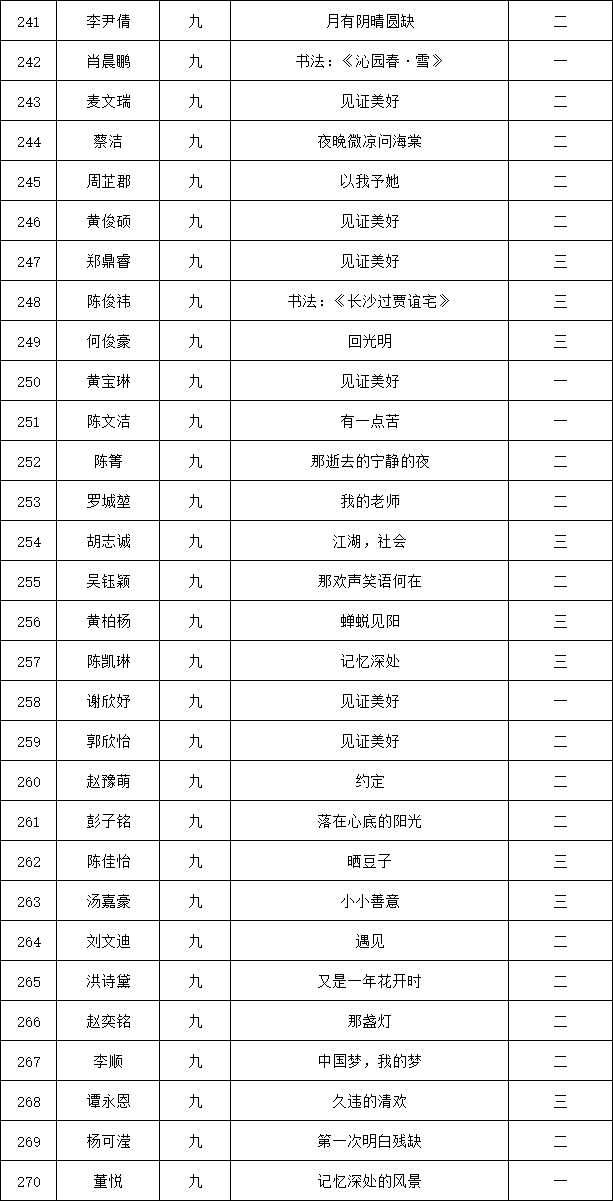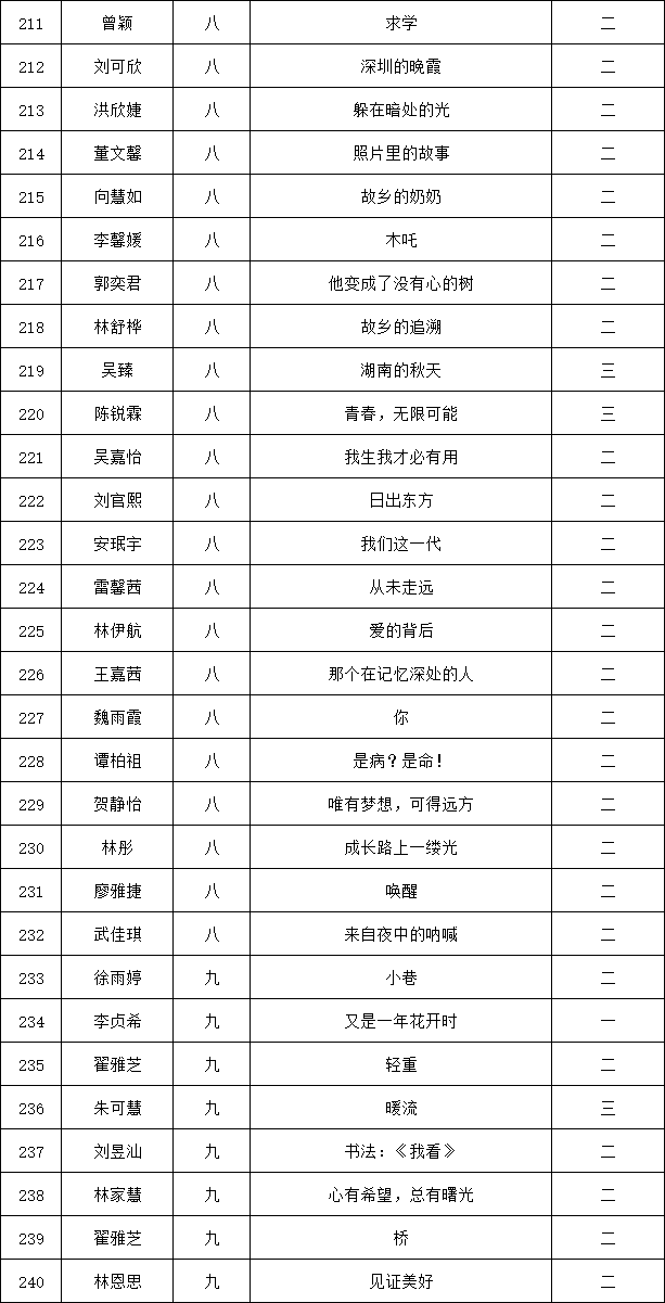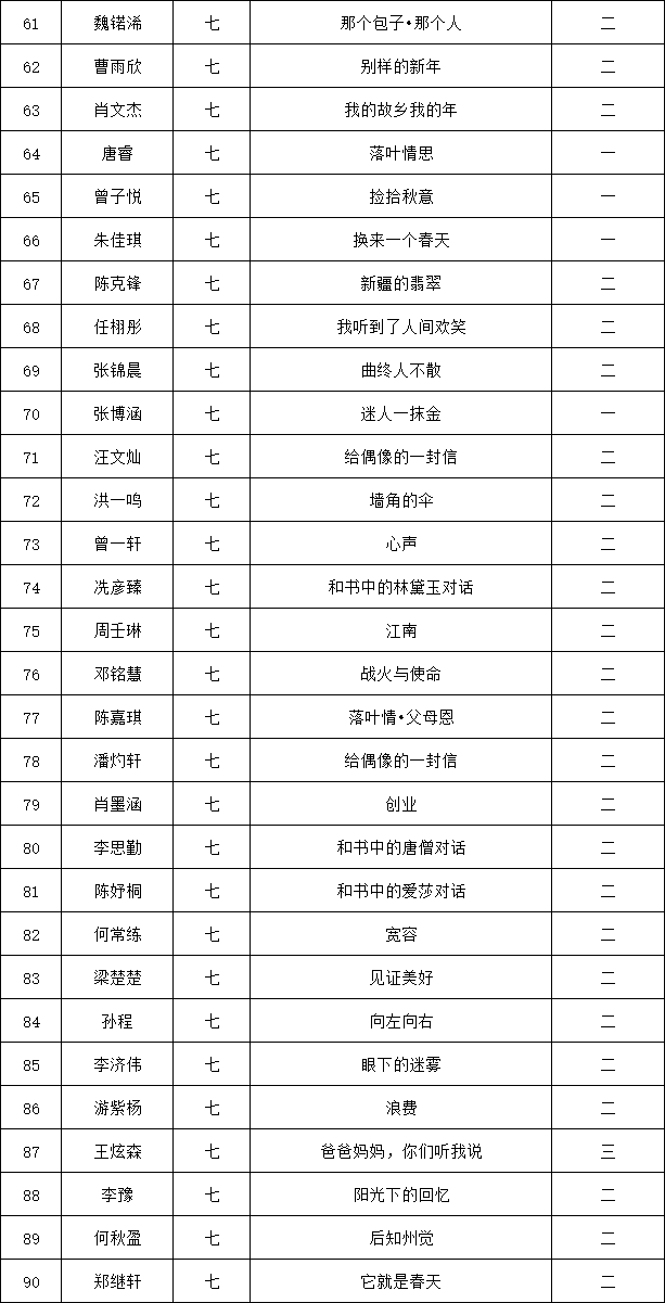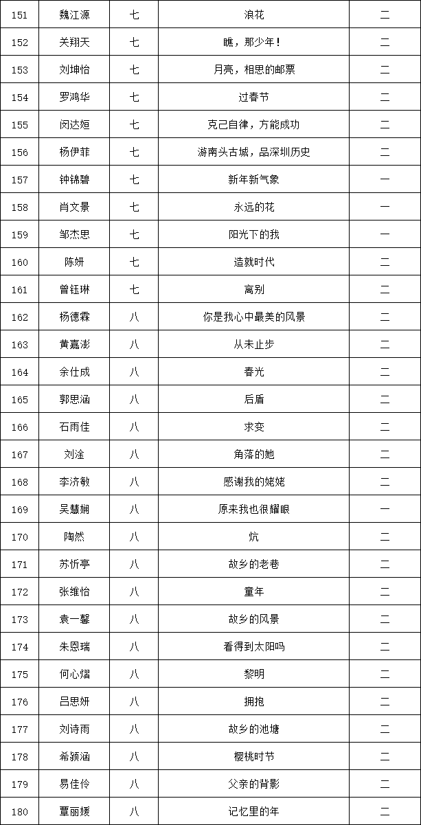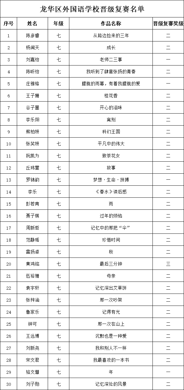 自2021年1月,活動征稿啟動以來,獲得了深圳市廣大中小學(xué)生、教師、文學(xué)愛好者的熱烈響應(yīng)積極參與,吸引了深圳百余所學(xué)校的上萬人關(guān)注報名?,F(xiàn)公布龍華區(qū)外國語學(xué)校專場晉級復(fù)賽名單如下: