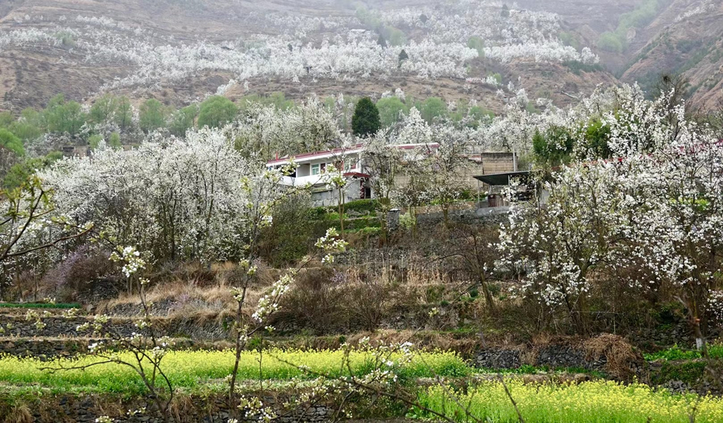 每年三到四月,金川縣的上百萬(wàn)株梨樹(shù)在春日照耀下盛開(kāi)白花,萬(wàn)畝梨海、百里吐蕊。李仁奇 攝