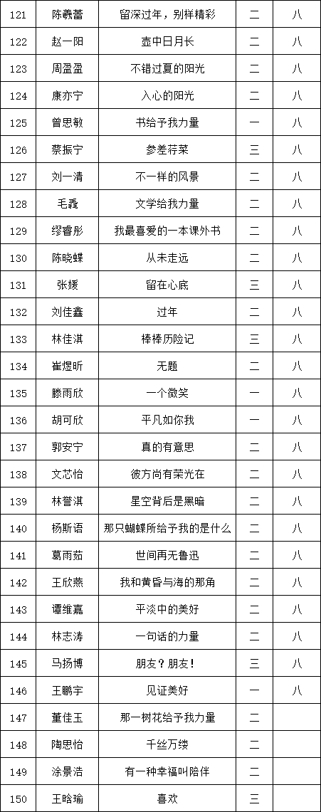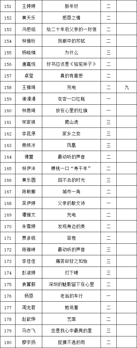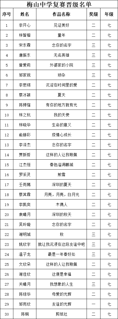 自2021年1月,活動(dòng)征稿啟動(dòng)以來(lái),獲得了深圳市廣大中小學(xué)生、教師、文學(xué)愛好者的熱烈響應(yīng)積極參與,吸引了深圳百余所學(xué)校的上萬(wàn)人關(guān)注報(bào)名?,F(xiàn)公布福田區(qū)梅山中學(xué)晉級(jí)復(fù)賽名單如下: