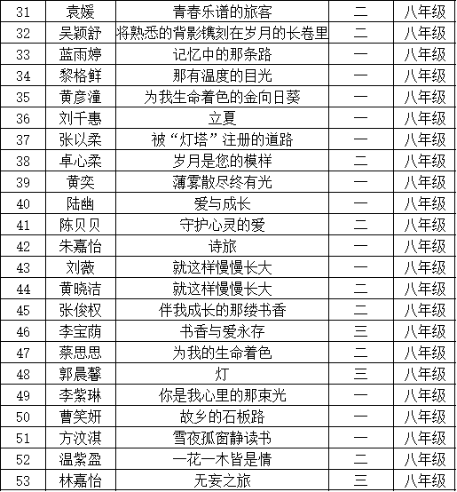自2021年1月,活動(dòng)征稿啟動(dòng)以來(lái),獲得了深圳市廣大中小學(xué)生、教師、文學(xué)愛(ài)好者的熱烈響應(yīng)積極參與,吸引了深圳百余所學(xué)校的上萬(wàn)人關(guān)注報(bào)名?,F(xiàn)公布光明區(qū)鳳凰學(xué)校晉級(jí)復(fù)賽名單如下: