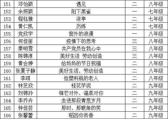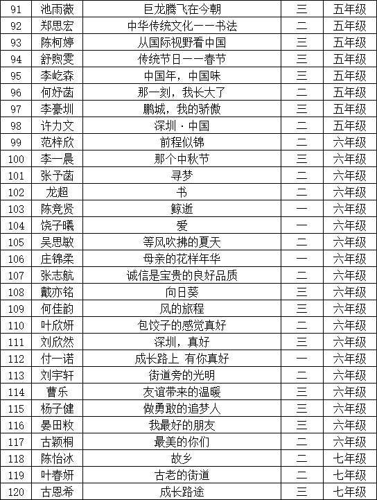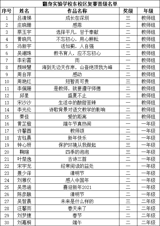 自2021年1月,活動征稿啟動以來,獲得了深圳市廣大中小學(xué)生、教師、文學(xué)愛好者的熱烈響應(yīng)積極參與,吸引了深圳百余所學(xué)校的上萬人關(guān)注報名?,F(xiàn)公布寶安區(qū)翻身實驗學(xué)校(東校區(qū))晉級復(fù)賽名單如下: