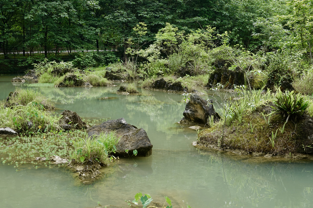 臥龍?zhí)哆吂质鏄?shù)林立,潭面如鏡子般平靜。李仁奇 攝