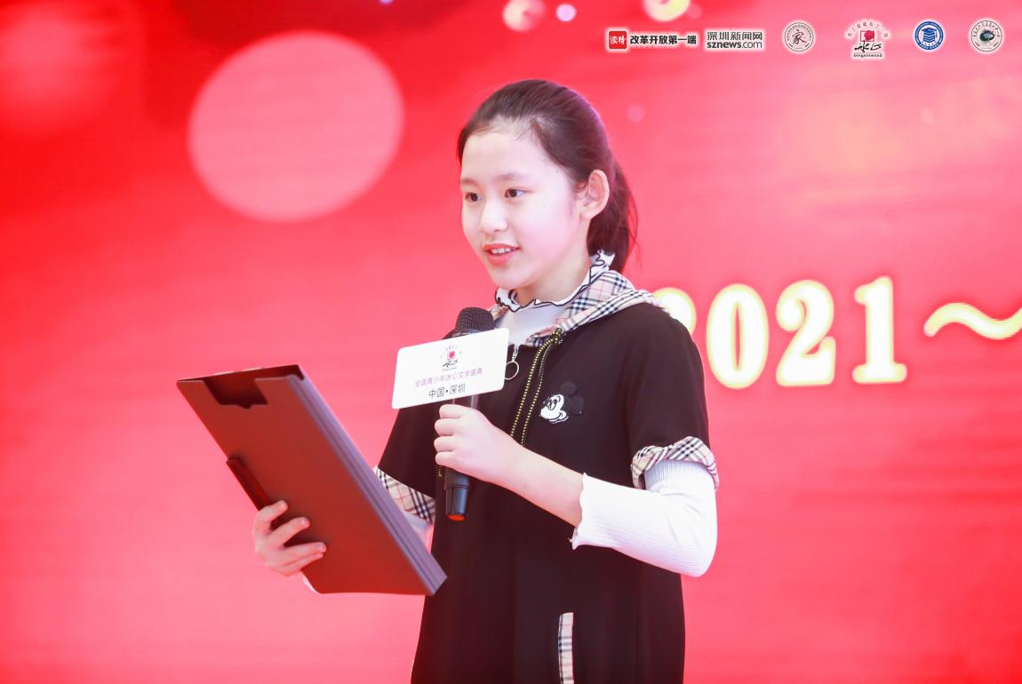 《中華文化現(xiàn)行倡導(dǎo)者》和《中華文化文學(xué)特長生人才庫》代表:荔園小學(xué)通新嶺校區(qū)李睿頤帶來原創(chuàng)詩朗誦《如果我能穿越六維空間就能展現(xiàn)邊陲小鎮(zhèn)——深圳的歷史變遷》
