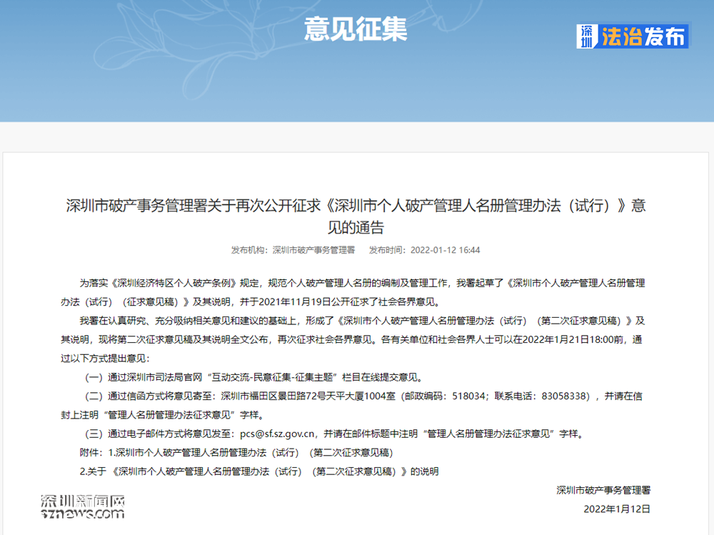 讀特客戶端?深圳新聞網(wǎng)2022年1月18日訊(記者 張玲)日前,深圳市破產(chǎn)事務管理署在深圳市司法局發(fā)布通告,面向社會征集《深圳市個人破產(chǎn)管理人名冊管理辦法(試行)》(以下簡稱管理辦法)的意見,有意提交者可在2022年1月21日18時前提交。