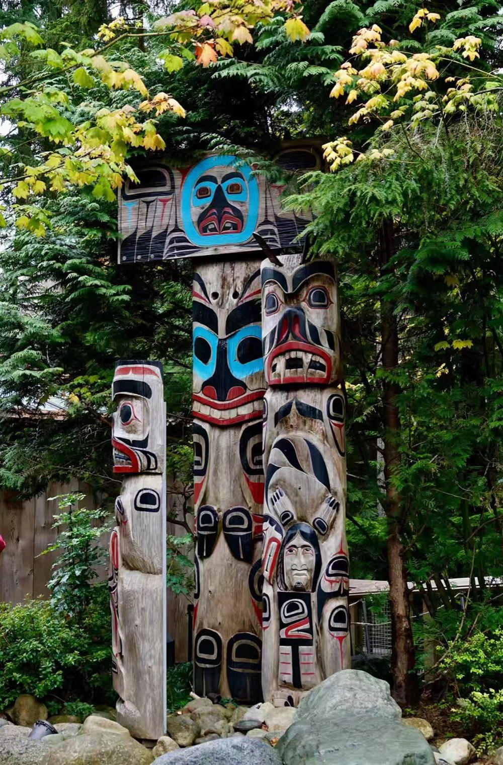 吊橋公園中,有幾十年前印第安人所雕刻且置放于此的圖騰柱,色彩鮮艷、引人注目。李仁奇 攝