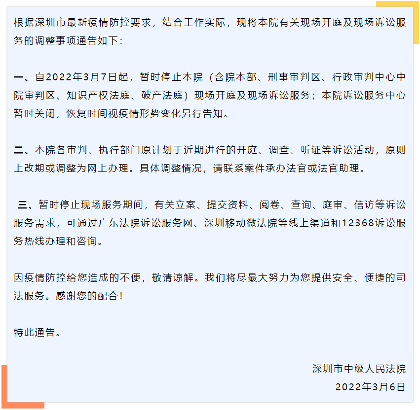 讀特客戶端·深圳新聞網(wǎng)2022年3月7日訊(記者 張玲)3月6日夜間,深圳市中級人民法院發(fā)布通告,從2022年3月7日開始暫?,F(xiàn)場開庭及現(xiàn)場訴訟服務(wù),訴訟服務(wù)中心也暫時(shí)關(guān)閉,恢復(fù)時(shí)間另行告知。