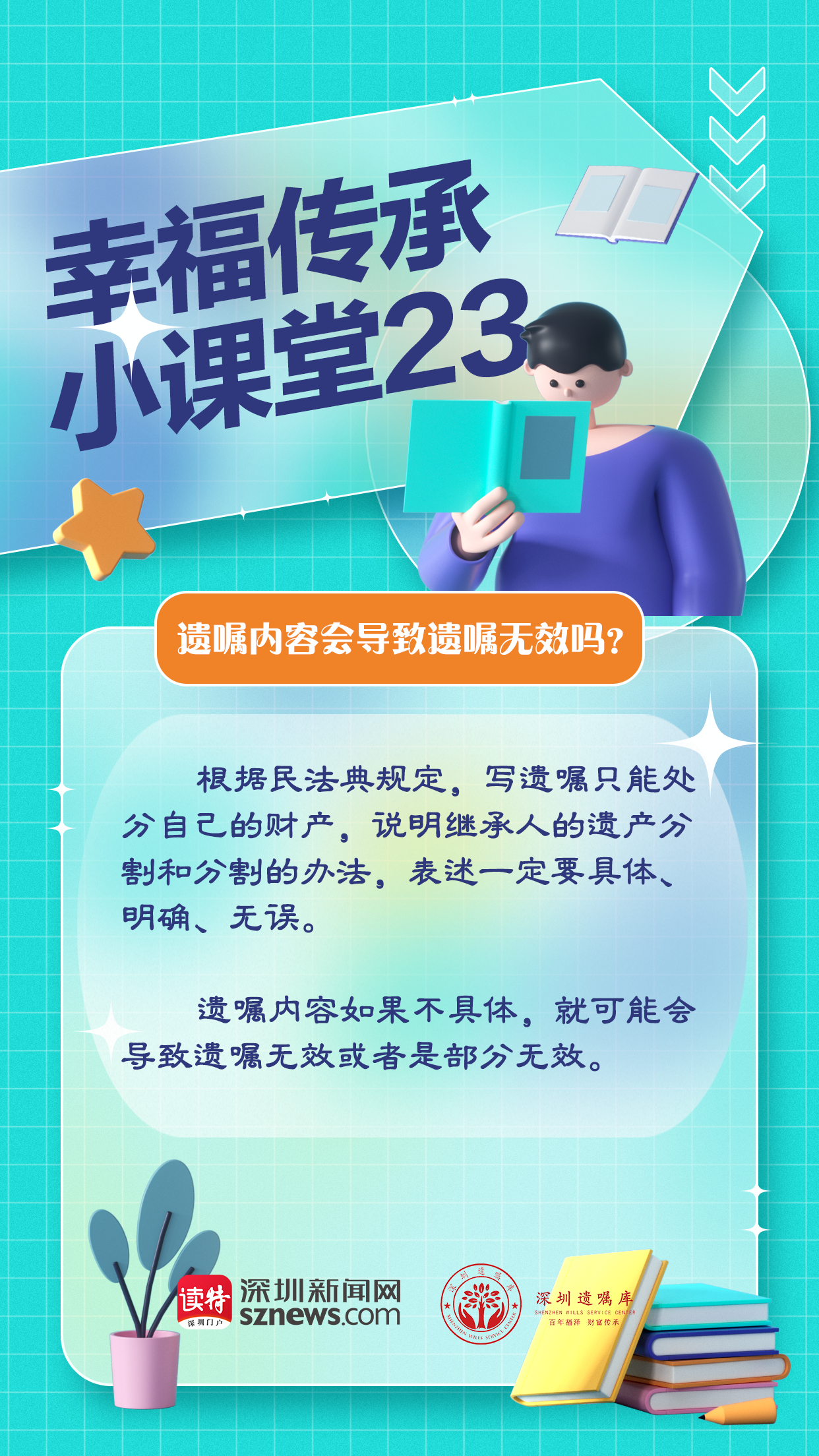 今天,由深圳遺囑庫與深圳新聞網(wǎng)聯(lián)合制作的幸福傳承小課堂第23期,我們就來說說,遺囑什么情況下可能無效。根據(jù)民法典規(guī)定,寫遺囑只能處分自己的財產(chǎn),說明繼承人的遺產(chǎn)分割和分割的辦法,表述一定要具體、明確、無誤。遺囑內容如果不具體,就可能會導致遺囑無效或者是部分無效。因此,李大爺不能將財產(chǎn)的全部都給到后老伴,法院也判定了這份遺囑是部分無效的。