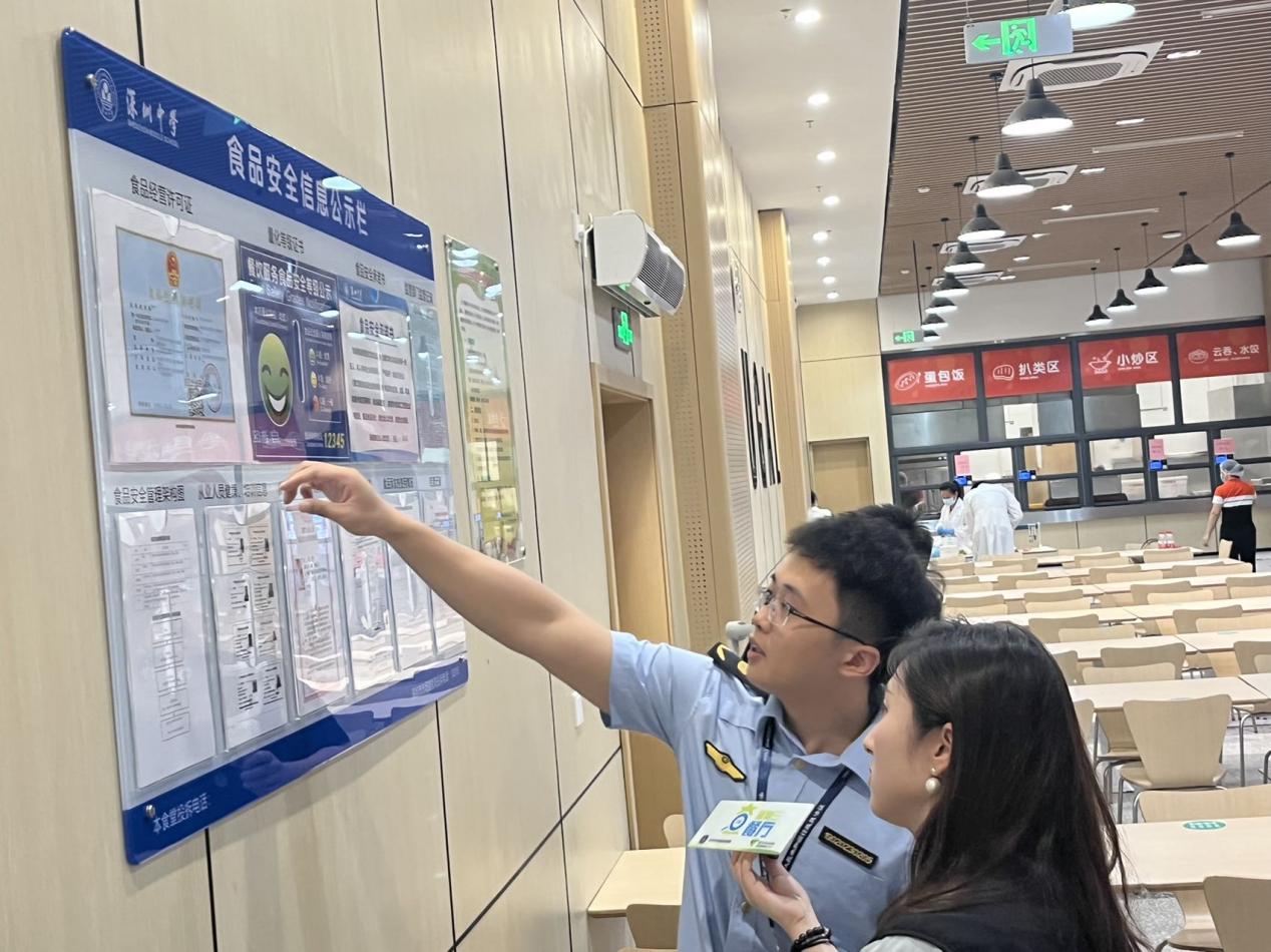 在食堂用餐區(qū),執(zhí)法人員依次查看食品安全公示欄、明廚亮灶系統(tǒng)、用餐區(qū)域消毒記錄等信息。檢查過程中發(fā)現(xiàn)部分從業(yè)人員健康證即將到期,深圳市市場監(jiān)督管理局羅湖監(jiān)管局執(zhí)法人員羅偉仁提醒,為保護(hù)從業(yè)人員自身及服務(wù)對(duì)象的健康,應(yīng)盡快更新辦理從業(yè)人員健康證。