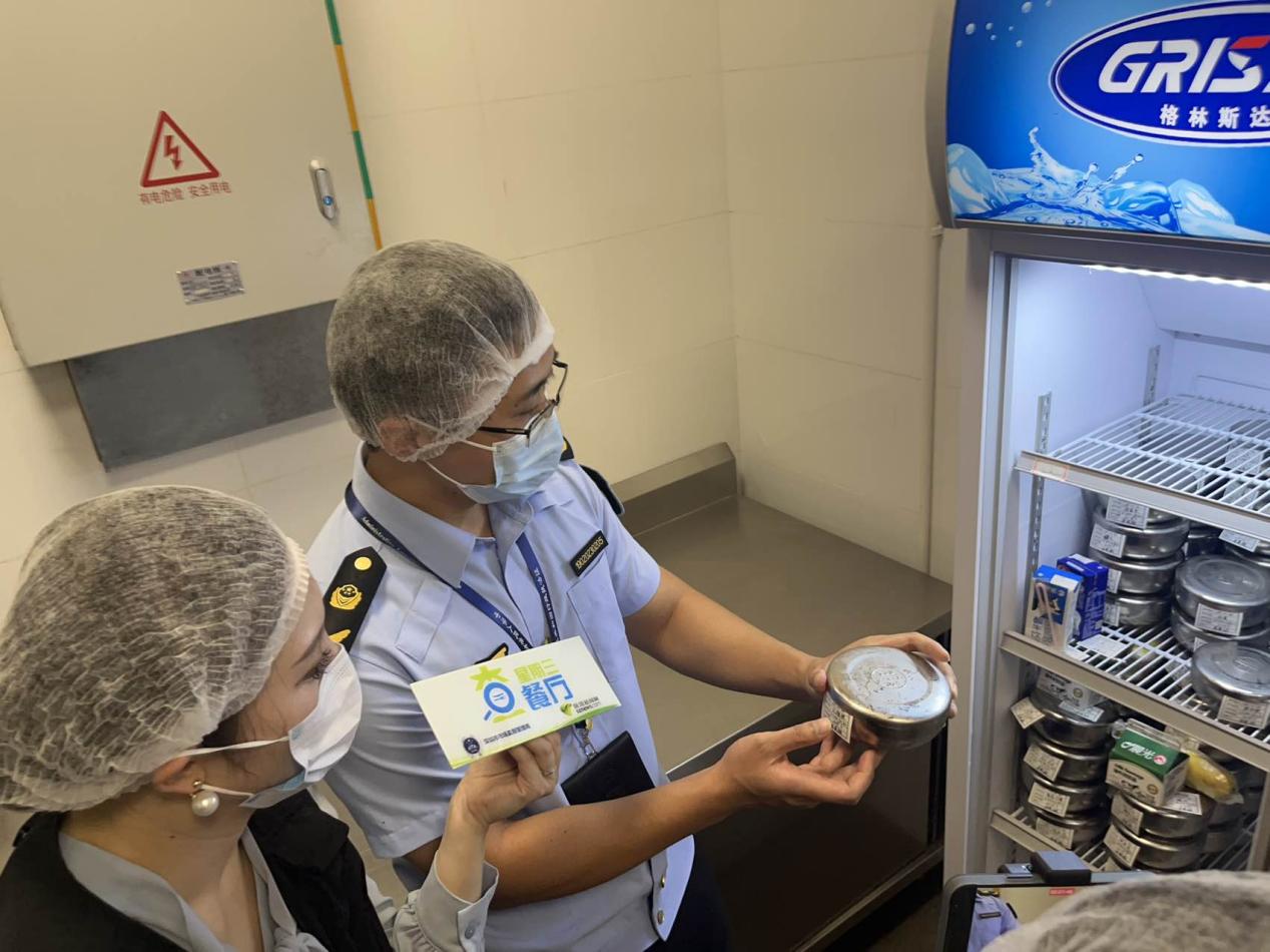 執(zhí)法人員一行在食堂用餐區(qū)域檢查。