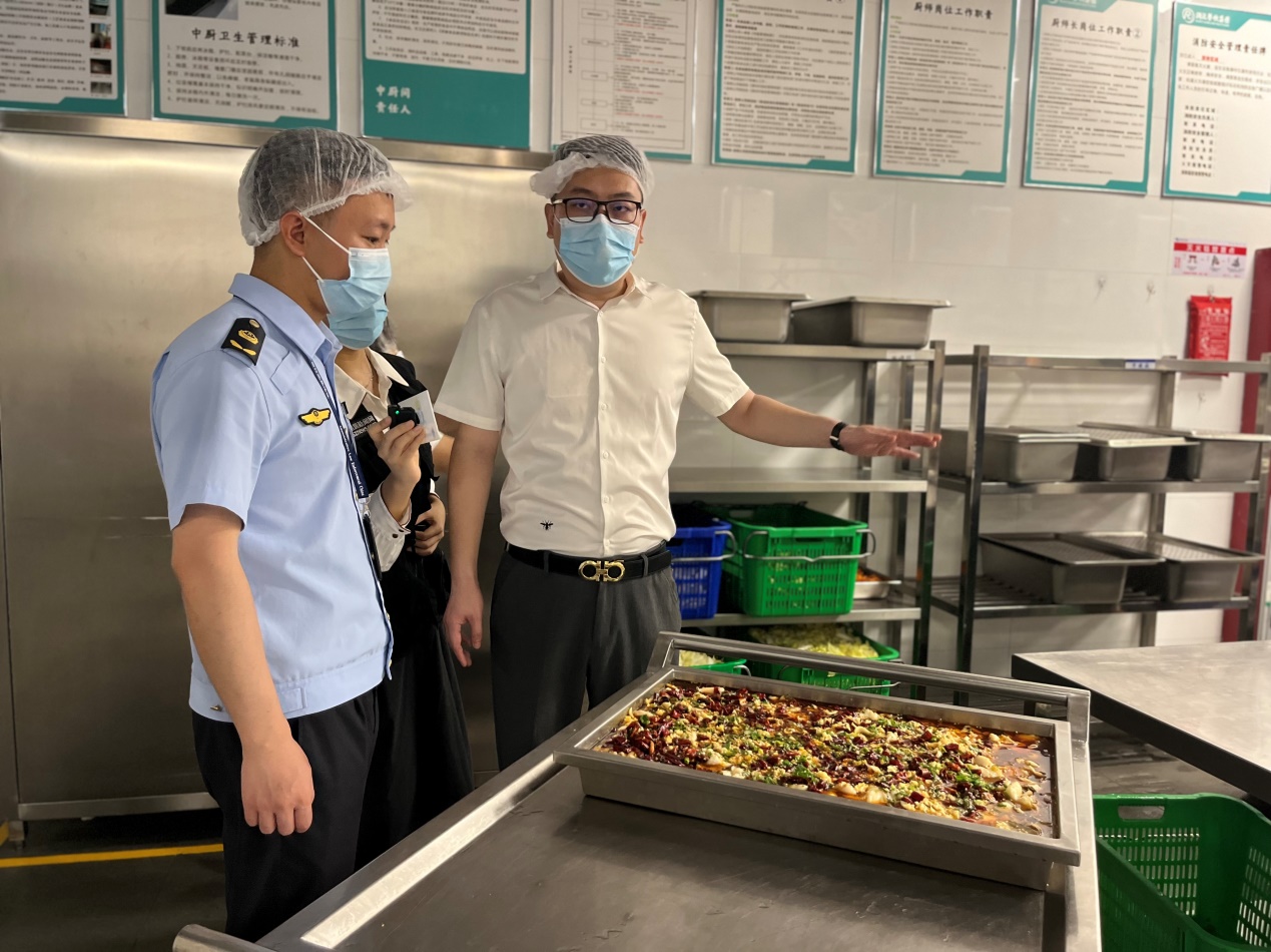 執(zhí)法人員現(xiàn)場對學校后廚進行詳細檢查,分別從采購索證索票、進貨查驗、制作加工、備餐配送、場所和設施清潔維護、餐飲具清洗消毒、從業(yè)人員健康管理,制止餐飲浪費,食品安全總監(jiān)配置履職情況,以及落實主體責任的“日管控周排查月調度”制度等方面進行詳細檢查。經檢查,整體情況良好,但存在部分細節(jié)問題,如水產品刀具分類可更細致、操作臺積水需清理、面點間的食材存放需避免陽光直射等,針對檢查過程中發(fā)現(xiàn)的問題,執(zhí)法人員現(xiàn)場責令學校限期整改到位。同時,快檢工作人員對餐廳使用的食材進行了抽檢,結果均為陰性。