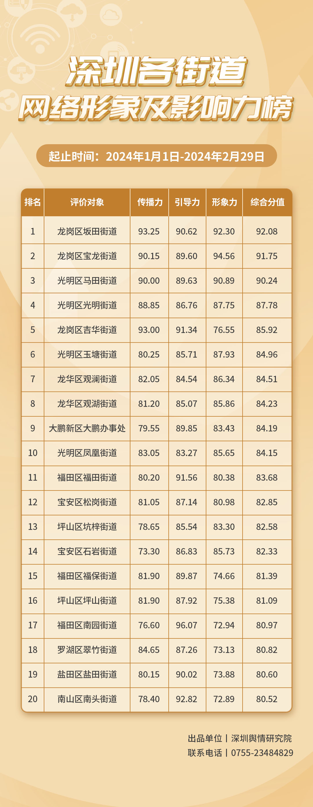 2024年3月,共有20個街道登上《深圳各街道網(wǎng)絡(luò)形象及影響力榜》,分別是:光明區(qū)光明街道、龍崗區(qū)坂田街道、龍華區(qū)龍華街道、龍崗區(qū)坪地街道、寶安區(qū)西鄉(xiāng)街道、龍華區(qū)大浪街道、龍崗區(qū)龍崗街道、龍崗區(qū)布吉街道、光明區(qū)公明街道、寶安區(qū)福永街道、寶安區(qū)松崗街道、光明區(qū)玉塘街道、南山區(qū)桃源街道、龍華區(qū)福城街道、寶安區(qū)新安街道、龍華區(qū)觀瀾街道、福田區(qū)沙頭街道、南山區(qū)粵海街道、坪山區(qū)坑梓街道、大鵬新區(qū)南澳辦事處。
