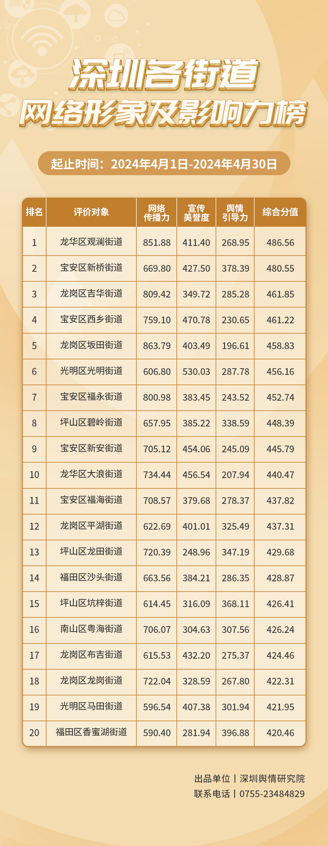 2024年4月,深圳市哪些街道在網(wǎng)絡形象及影響力塑造方面表現(xiàn)甚佳?讓我們共同關注。本期榜單數(shù)據(jù)統(tǒng)計范圍為2024年4月1日至4月30日。