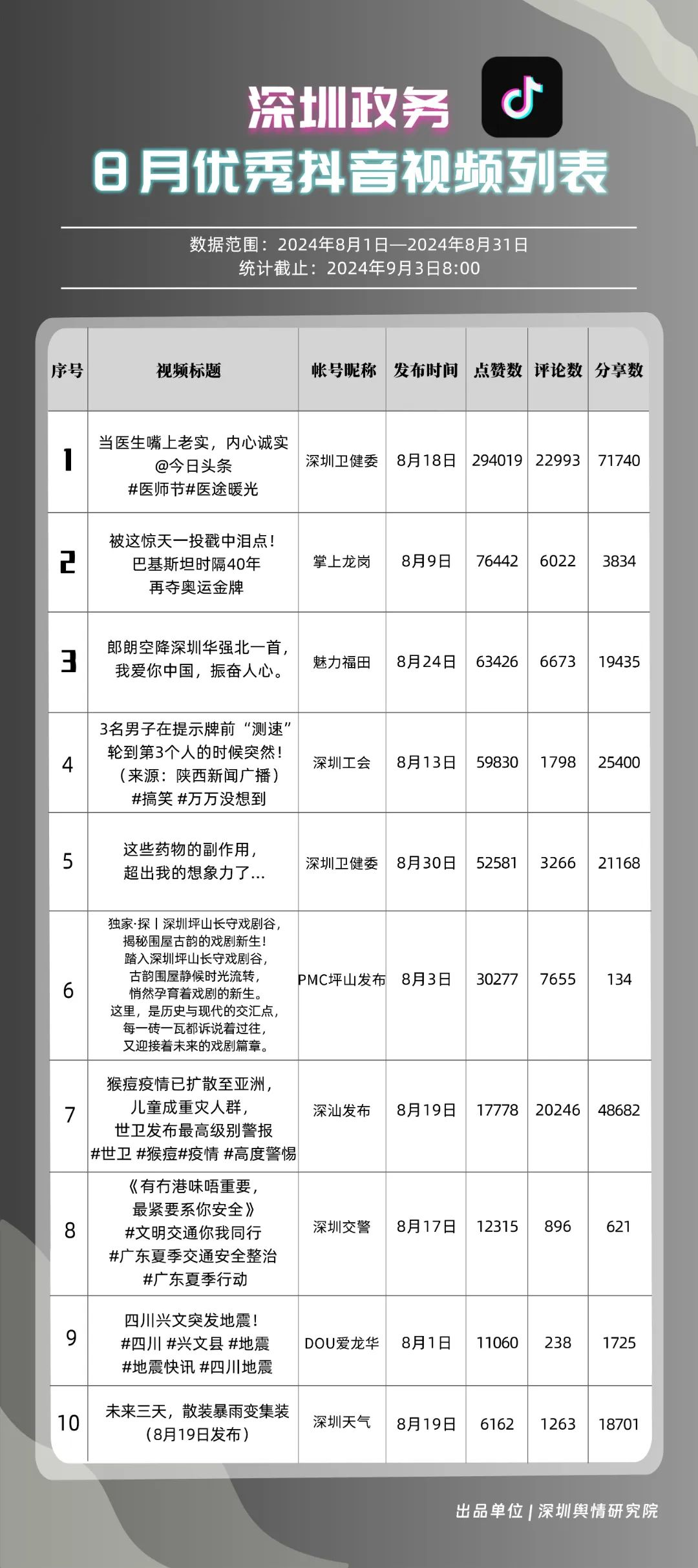 8月,“深圳衛(wèi)健委”“深汕發(fā)布”“掌上龍崗”“魅力福田”“深圳天氣”“深圳工會(huì)”“DOU愛(ài)龍華”“PMC坪山發(fā)布”“深圳交警”和“深圳公安”共10個(gè)政務(wù)抖音號(hào)獲得優(yōu)秀稱號(hào),“深圳衛(wèi)健委”“深汕發(fā)布”“掌上龍崗”以高分居榜單前三,賬號(hào)有關(guān)“醫(yī)師節(jié)”“猴痘”“奧運(yùn)金牌”的視頻獲得了較高的關(guān)注度和討論度,相關(guān)優(yōu)秀視頻在傳播信息的同時(shí),也展現(xiàn)了深圳政務(wù)抖音號(hào)在內(nèi)容質(zhì)量、互動(dòng)性和傳播度方面的實(shí)力。